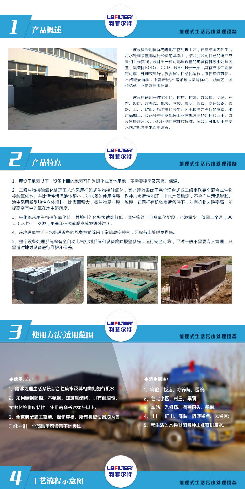 該設(shè)備采用國際先進的生物處理工藝,在總結(jié)國內(nèi)外生活污水處理裝置的運行經(jīng)驗基礎(chǔ)上,結(jié)合我公司自己的研究成果和工程實踐,設(shè)計出一種可地理設(shè)置的成套有機廢水處理裝置,集去除BOD5、COD、NH3于一身,具有技術(shù)性能穩(wěn)定,處理效果好,投資。遠誦,維護操作方便等特點