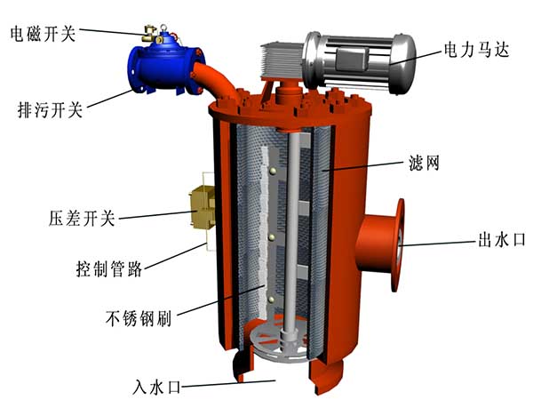 自清洗過濾器主要組件有:電機、電控箱、控制管路、主管組件、濾芯組件、316L不銹鋼刷、框架組件、傳動軸、進出口連接法蘭等。