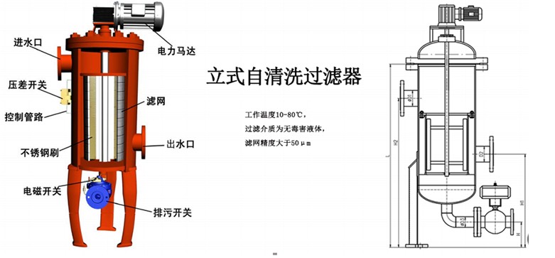 自清洗過濾器是一種利用濾網直接攔截液體中的雜質 ,漂浮物,顆粒物等,同時降低水的濁度,減少污垢,同時保障后面設備正常工作及使用壽命的精密設備,可有效的解決冷卻循環水系統中的雜志或因結垢生銹產生固體懸浮物,自清洗過濾器,運行及控制不需外接任何能源就可以自動清洗過濾,自動排污。反沖洗期間不斷流,清洗過濾可以調節,自清洗過濾時間默認為10-60/s ,清洗過濾損失水量只占過濾水量的0.08 - 0.6% ;過濾精度可達10-3000微米;工作壓力可達1.0-1.6Mpa ;單臺流星: 4-4160m3/h。可立式、臥式、倒置任意方向任意位置安裝。
