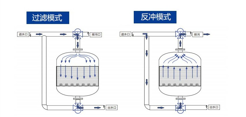 隨著雜質在填料層中不斷聚積 , 內部壓頭損失將不斷增大。當進、出水壓頭損失達到設定值或達到設定時間時 , 系統將自動激活定壓差裝置使其轉換至反洗狀態 , 當此臺反洗結束,水力閥改變給水方向從而實現逐臺反洗 , 更便于清洗聚積起來的雜質