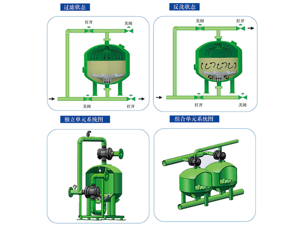 隨著雜質在填料層中不斷聚積 , 內部壓頭損失將不斷增大。當進、出水壓頭損失達到設定值或達到設定時間時 , 系統將自動激活定壓差裝置使其轉換至反洗狀態 , 當此臺反洗結束,水力閥改變給水方向從而實現逐臺反洗 ,