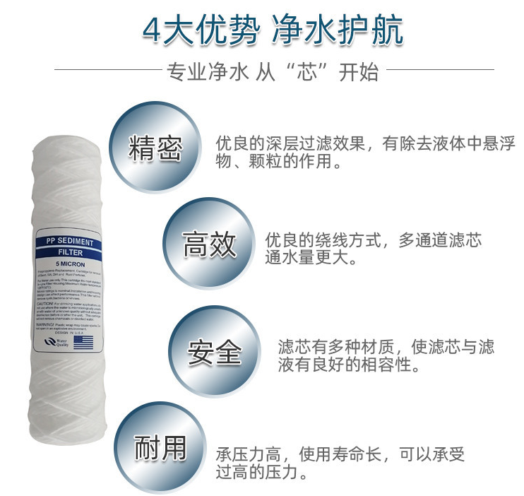 3. 線繞濾芯由不同多種材料制成,確保各種液體過濾要求,達到較佳過濾效果。